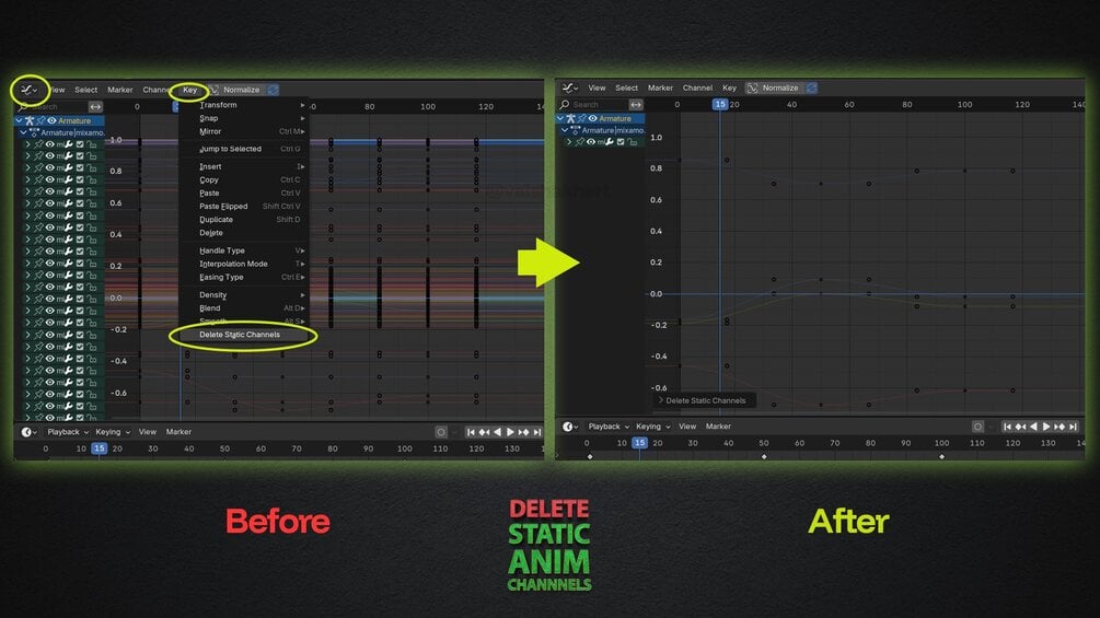 Delete Static Animation Channels is a animation cleanup tool that identifies and removes "static channels" - F-Curves where all keyframe values remain constant throughout the animation timeline. This common issue occurs during bulk keying operations, automated imports, or simulation bakes, where keyframes are inserted for all properties even when only some values actually change.